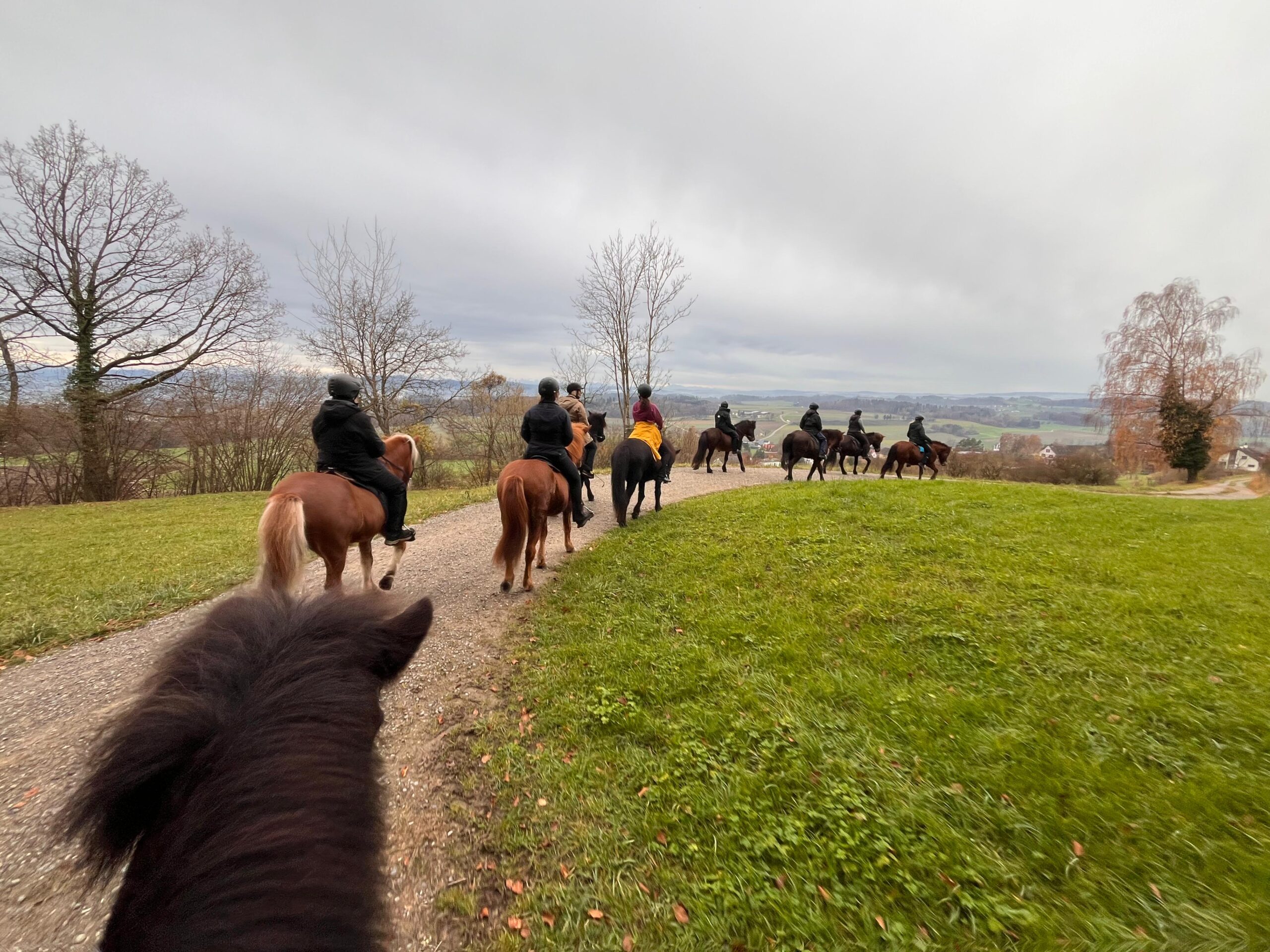 Von dort ging es zuerst ausgedehnt im Schritt los, bis wir die schönen Töltwege erreichten und quasi durchtölten konnten bis zum Chalchrain. Die Pferde fanden sich schnell zu einer Gruppe, sodass das ein volles Vergnügen war. Beim Chalchrain ging es dann am Hang «eine Stufe tiefer», und weiter gings nach einer kurzen Graspause bis nach Hüttwilen.